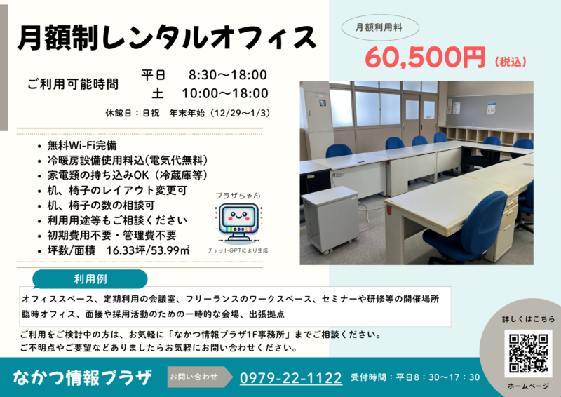 - 施設のご利用は中津市条例『なかつ情報プラザの設置及び管理に関する条例』に準拠いたします。