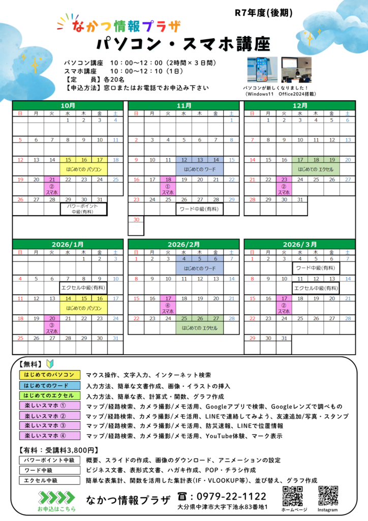 令和7年度(後期)の講座 2025年10月6日 最終更新日時 : 2025年10月10日 管理者 令和7年度も後半が始まりました、10月以降も無料のパソコン講座やスマホ講座、有料のパソコン講座をご準備しています。 窓口またはお電話でお申込み下さい。みなさんのご参加お待ちしています。